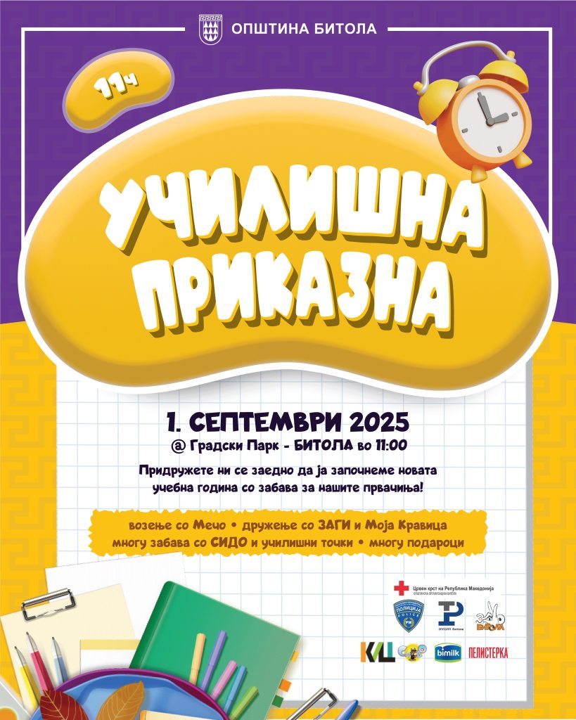 Општина Битола во соработка со ЈП Паркинзи и подржувачите на настанот Зоолошка градина, Културно Информативен центар, Црвен Крст, СВР Битола, БиМилк и Пелистерка со голема радост на 1 септември во Градски парк од 11 часот, ги покануваат првачињата од сите основни училишта во општина Битола на првата „ Училишна приказна “ .