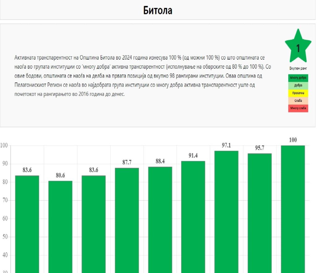 ОПШТИНА БИТОЛА ПРОГЛАСЕНА ЗА НАЈТРАНСПАРЕНТНА ОПШТИНА ЗА 2024 ГОДИНА